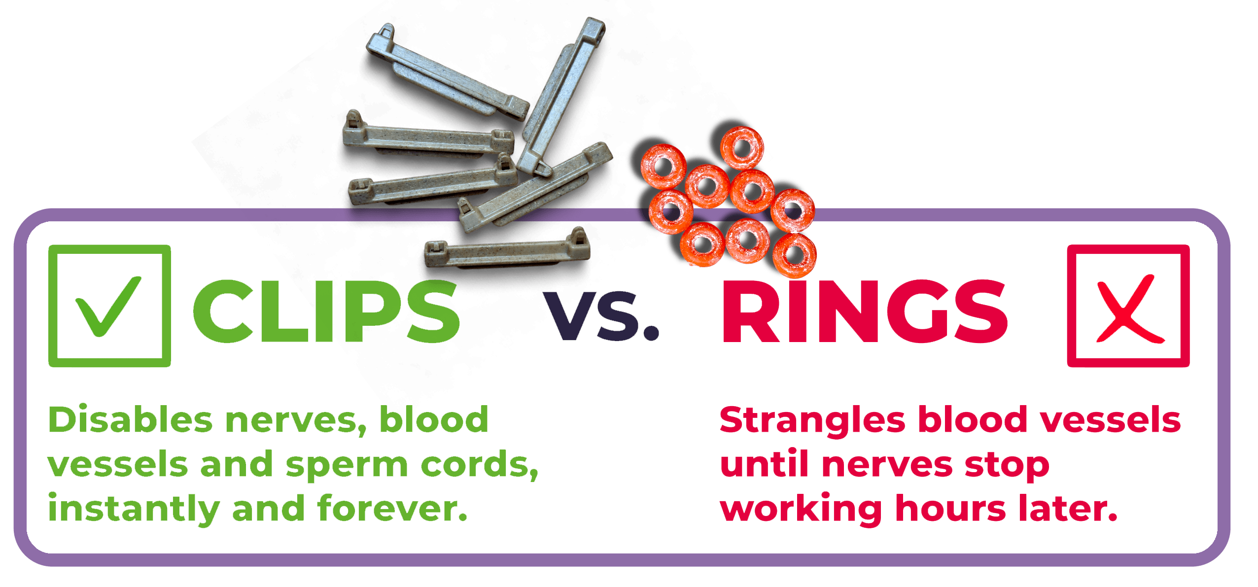 It’s simple – Plastic Clips replace rubber rings. The ClipFitter is a modernised Burdizzo so all cords, nerves and sperm cords included, are disabled on application.