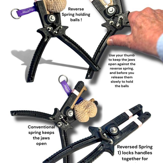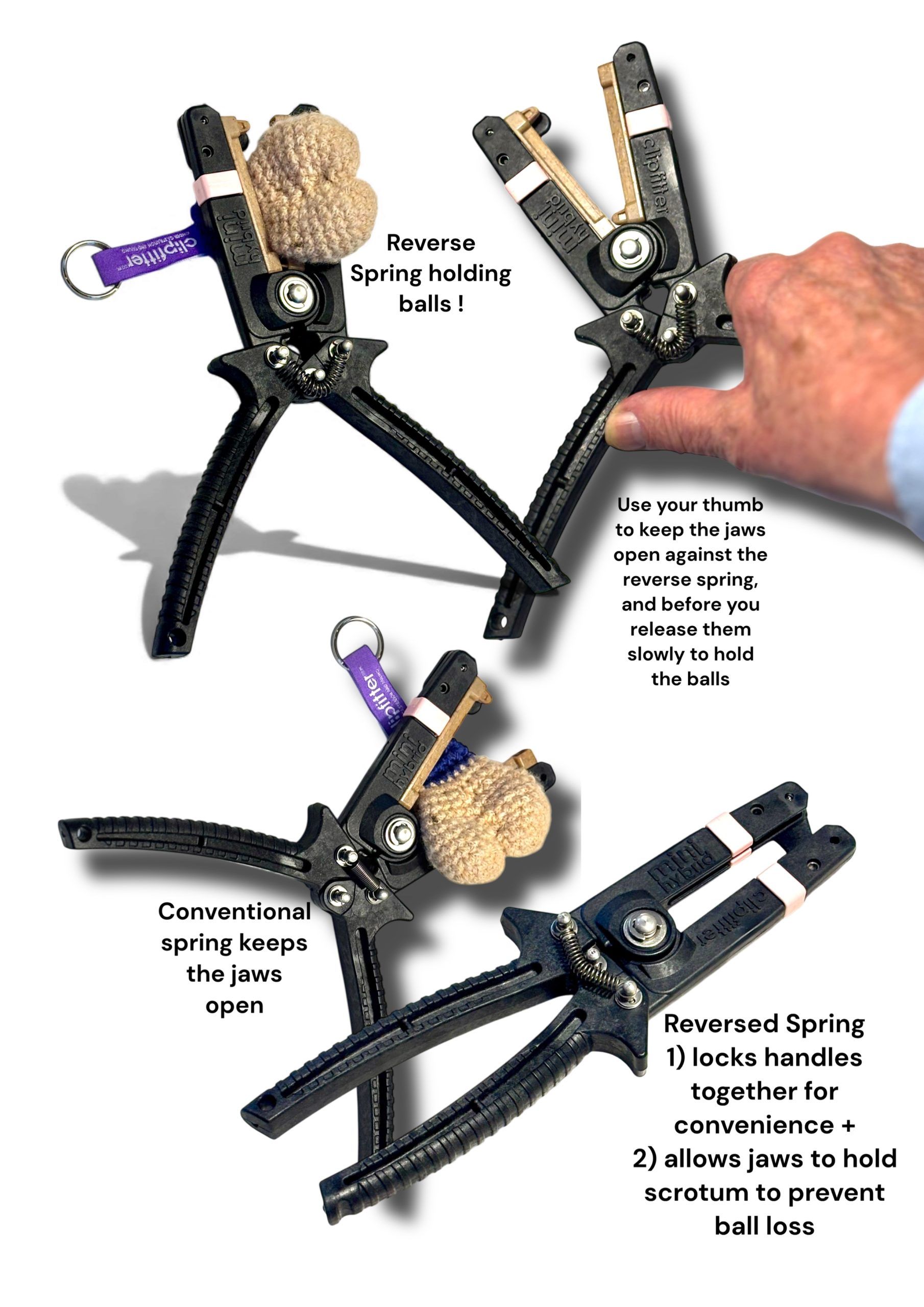 Our introductory 'bundle' will let you try out ClipFitter and benefit from the experience of being kinder to your lambs. Mini Hybrid has two surprising 'modes' of working 1) a conventional plier which always wants to have the jaws open and b) in reverse mode where the jaws want to close. It's like combining our double and single handle versions of our steel ClipFitters ! This pic shows the spring in reverse and holding balls or tail while you let go !